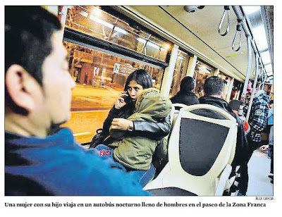 «Una mujer con su hijo viaja en un autobús nocturno lleno de hombres en el paseo de la Zona Franca»