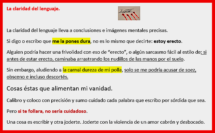 En un tiempo éste en el que familia y amigos buscan afecto, fraternidad y solidaridad; solo quiero follarte, porque tu corazón y las ternuras que contiene, lo tengo yo, donde falta el mío. Con tu amor no necesito el de nadie, tu cuerpo me fascina y me da el placer que el planeta y las cosas que lo habitan, jamás han podido ni podrían ofrecerme; ni yo lo quisiera. Que si dios existe me libre de los afectos de los vulgares, de los innecesarios.