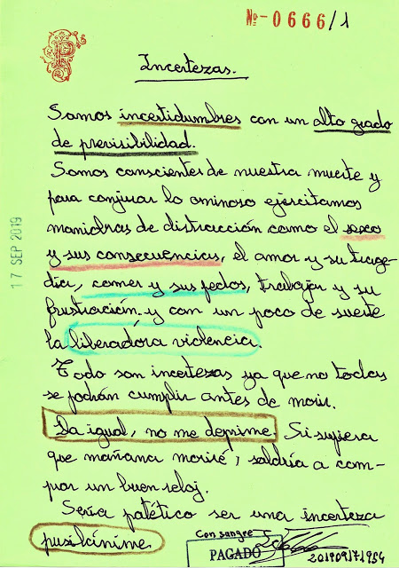Hay quien en la soledad se siente abandonado, desgraciado. Como una pequeña isla en el océano, zarandeada por huracanes y tormentas. Con escasos y breves momentos de bonanza. Precisa de alguien para aliviar sus miedos y por lo que pudiera quedar tras la tormenta. Observa con triste envidia los archipiélagos en el horizonte, con ojos esperanzados y el alma arrellanada en la tristeza por el temor a la soledad. Siempre es bueno tener compañía y con ello, ayuda. Es además, socialmente bueno, cuasi necesario. Y si además la metes o te la meten, dos veces bien. Y así, con el concepto mercantil de la compañía, buscan otras personas para combatir esa soledad, como si dos soledades se pudieran restar. La cobardía alimenta la ingenuidad injustificada: las soledades se suman: dos compartiendo la soledad, son dos seres aislados, acobardados. Dos hastíos… Su relación solo se basa en el miedo, comprar o rentar compañía por mala que sea; por mucho hastío que produzca. Así se fraguan algunos matrimonios longevos que no comparten amor, solo miedo. Y el negocio suele ser perfecto. Sin embargo la mayoría de amores mueren por engaños, por hartazgo y por hijos que no saben muy bien cómo cuidar. Ni para qué cojones los quieren. La soledad es la máxima expresión de la libertad, eso es lo que nadie comprende. Nadie entiende la libertad como la absoluta ausencia del temor al aislamiento, a la enfermedad, a la vejez, a la incapacidad, a la muerte. Solo muy pocos entienden que soledad es libertad. El resto, no sabrían que hacer con la libertad, como no saben qué hacer con ella los humanos que han estado largo tiempo bajo el gobierno de un tirano. Si se encuentran en grandes espacios abiertos y naturales, tras la euforia inicial, en pocas horas necesitarán refugiarse de nuevo en su corral; es demasiado espacio para sus mentes. Sin embargo, cuando van en pequeños grupos o grandes rebaños, se relajan y dicen sentirse en libres. Bendito el banal y festivo aire puro de mierda… Es esa cobarde animalidad humana la que me enfurece, la que hace que las venas de mis sienes se inflamen con una ira inusitada. Esa esclavitud ajena del continuo roce y trato con otros congéneres me hace hostil a mi propia especie. Si te amo, lo hago para compartir mi soledad, mi libertad contigo. No para combatirla o conjurarla. Quiero ser libre contigo, cielo. Mi libertad es mi bien más preciado, vivirla contigo es un acto de amor. Donde quiera que estés, quien quiera que seas, mi deseada solitaria. No es romanticismo, solo soy un animal libre. Follar contigo, hablar contigo, cazar contigo, odiar contigo… Y cuando el sol hace negras murallas y tenebrosas sombras de las montañas, observar cansados el movimiento planetario tumbados o sentados sobre la tierra. Confesarte en voz baja mis tantas frustraciones, mis tantos errores, tanto tiempo perdido sin ti. Celebrar con serenidad y ternura el nacimiento y la muerte de los días. Solo una cosa, amor: quiero morir solo, le temo al ridículo. Sé que es como correr tras el viento, que si existes no estoy en el lugar o tiempo adecuado. Que es tarde… Siempre es tarde, cielo, quien quiera que seas. Solo soy un tipo que escribe con los ojos entornados por la caricia de un aire fresco de un otoño que, convertirá las hojas que han de morir en oro y sangre antes de caer como joyas al suelo desde de sus ramas. No importo demasiado en el esquema general de las cosas. No importo nada. Eso me hace libre también. Y un tanto optimista, sin que sirva de precedente. Sin miedo. Sin miedo a los grandes espacios. Sin miedo a morir solo. Garabateada con estas letras en mi cuaderno de libertades, con la secreta ilusión de encontrarte. No hay tristeza, solo una sonrisa franca. Hasta siempre jamás, mi bella libre, mi bella valiente.