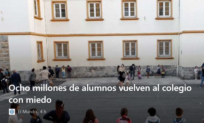 “Más de ocho millones de alumnos comienzan a partir de esta semana un curso escolar en el que no podrán darse abrazos, ni jugar al balón, ni compartir el bocadillo. Tras medio año sin pisar un aula, los padres volverán a llevar estos días a sus hijos al colegio con incertidumbre y temor al contagio por Covid-19.”