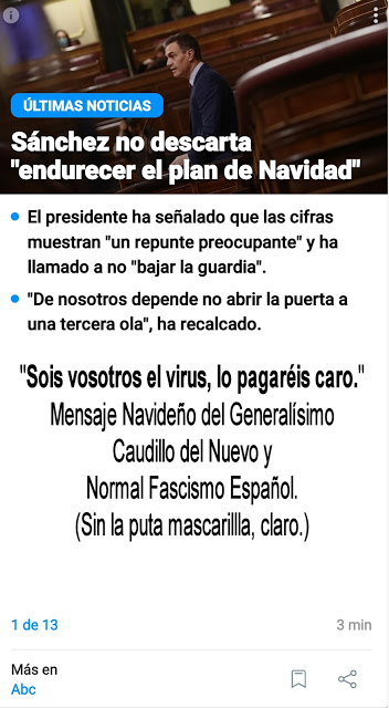 Y es que se acerca la navidad y el fascismo nuevo y normal del gobierno español, se siente obligado a proclamar su poder y así, estar presente en todas las mentes y casas de sus cabestros votantes o ciudadanos españoles (de una España muy profunda y endogámica).