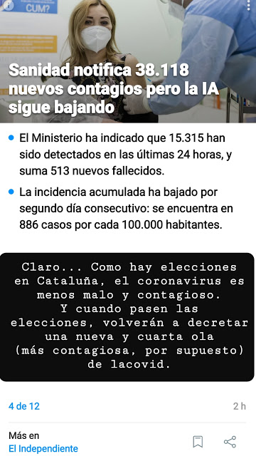 Baja el índice de contagios de coronavirus como una noticia de buenaventura para las elecciones al peor cacique en Cataluña. Para votar no habrá problema alguno en trasladarse al puto Polo Norte, porque es del interés del fascismo que la chusma votante los elija. Y así mismo que el cabestro electorado, los autorice moralmente a continuar con la cárcel, el toque de queda, la represión y la bofia, como otro coronavirus más, pululando fiera por multar y proteger al mundo de los cochinos ciudadanos. Además de recibir de los tristes votantes amedrantados por respirar, la mejor y más sodomita y servil sonrisa tras el bozal de mierda.