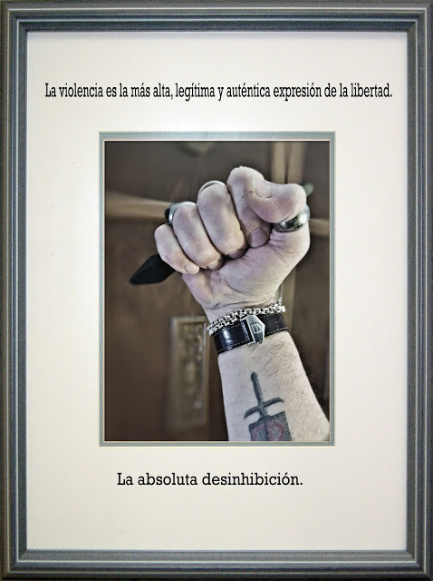 Si la frustración y el desánimo se extienden por la piel, si la rabia al salir de la garganta, no da consuelo; es hora golpear todo lo cercano sin control. Lesión y dolor son remedios eficaces para aliviar la presión. Cuando la violencia se retiene demasiado tiempo, se convierte en sadismo y es infinitamente peor; cuando se derrama sangre ajena con una violencia reprimida, se crea fascinación y narcosis. No se debe prolongar lo inevitable. Y al fin y al cabo, la violencia es la más alta, legítima y auténtica expresión de la libertad.