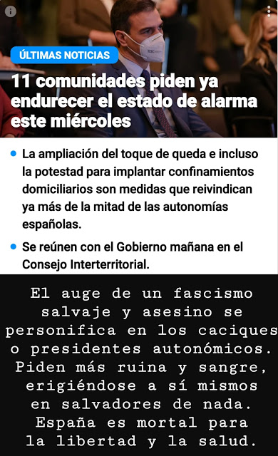 Son como verracos hambrientos, están completamente desbocados de ambición y mesianismo. Y de una mezquina cobardía que funde cualquier asomo de dignidad. Se han propuesto matar el coronavirus, matando a la gente de hambre y violencia. Los caciques autonómicos españoles son peligrosos como picadura de garrapata.