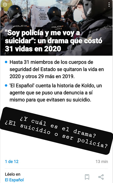 Es el siguiente paso a cualquier régimen totalitario, sea comunista o fascista: crear el nuevo y normal martirologio del fascismo español. España, por medio de su prensa, hace mártires de los represores, serenos y carceleros. Como la bofia no tiene muy buena fama (por decir lo mínimo) la prensa del fascismo se dedica a crear melifluas y falsas piedades en los votantes y otros cabestros; como que es mejor no tener un ápice de libertad y estar sometido, a ser policía y suicidarse, por ejemplo. Todo son ventajas para los oprimidos, extorsionados y los encarcelados del fascismo español. Desde luego, los fascismos no entienden de sutilezas ni inteligencia. Franco hacia lo mismo, nada nuevo bajo el sol. Pobres… Tan aplicados en sus extorsiones, abusos y control…
