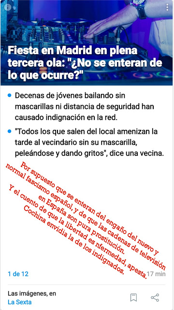 No hay ninguna cepa de mierda “más contagiosa”. Simplemente ha sido que la chusma, al usar masivamente y a todas horas (incluso en sus putas cenas de navidad) los bozales, se han debilitado. Una respiración pobre, hace una sangre pobre y un sistema inmunológico aún más pobre, agravado por la cobardía y la ansiedad que les provoca el machacón adoctrinamiento del miedo y la obediencia del nuevo y normal fascismo español. Todo el mundo lleva mascarilla y los contagios se han cuadriplicado; porque yo veo a todo cristo con su bozal y su miedo, cada día y a todas horas. Y bien calladitos todos en las noches negras del toque de queda, aguantando un nuevo franquismo por pura cobardía. Gracias al bozal y la cárcel domiciliaria más gente se ha contagiado de gripe y acatarrado. Y el fascismo español lo suma todo al coronavirus para seguir manteniendo sus toques de queda y el control de la chusma mediante miedo y represión obligando el uso del bozal. Claro que se enteran los que bailan y hacen uso legítimo y ético de su libertad. Se enteran de que el bozal, la prisión y el toque de queda solo han servido para que haya más enfermos y una dictadura criminal apoyada en los pilares de la estafa de la pandemia. Están hasta los huevos del nuevo y normal fraude español. Así que la indignidad de los envidiosos en las “redes suciales” viene porque alguien que tiene cierto valor para rebelarse contra la dictadura, los hace a ellos cobardes y cabestros. Y por mucho que lo sean, no es agradable verse en el espejo como lo que realmente se es. Los envidiosos quieren que todos sean como ellos para no salir retratados ilustrando las entradas de mezquindad y e ignorancia en la Gran Enciclopedia de la Humanidad. Por otra parte, tampoco sabrían qué hacer con la libertad si la tuvieran; salvo ir al centro comercial en borregada. Son todos una piara de cobardes quejumbrosos, prosélitos de una secta del engaño. Y claro, las redes sociales son el espejo del borreguismo, la ignorancia y la cobardía. Las cadenas de televisión españolas, son la gacetilla del fascismo, la prostitución pura de la ética y el periodismo. La Sexta causa vómito y la Primera risa. Antena 3 prurito genital y así todas y cada una de ellas. No hay ni una sola cadena televisiva libre de ser puta del nuevo y normal fascismo español del coronavirus.