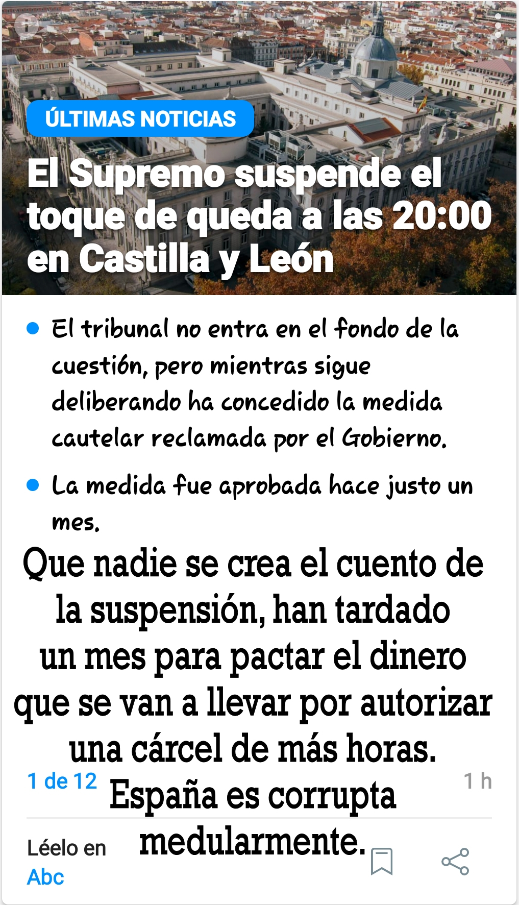 El tribunal supremo ha tardado un mes haciendo la comedia de que anula la cárcel o toque de queda en la taifa de Castilla. Y tibiamente, dicen que no están muy seguros. Con toda probabilidad están esperando a llegar a un acuerdo monetario con los caciques autonómicos y los Caudillos de España, para dar rienda suelta a la orgía de la nueva dictadura y extender la cárcel para el ciudadano hasta cuando a ellos les venga en gana.