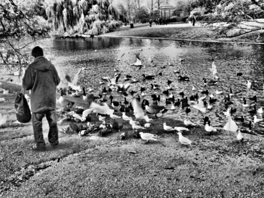 Hay personas que dan comida a palomas y patos salvajes (si se puede llamar comida a unas mierdosas migas duras de pan enmohecidas) de forma habitual, ritual. Como si tuvieran pendiente alguna expiación.