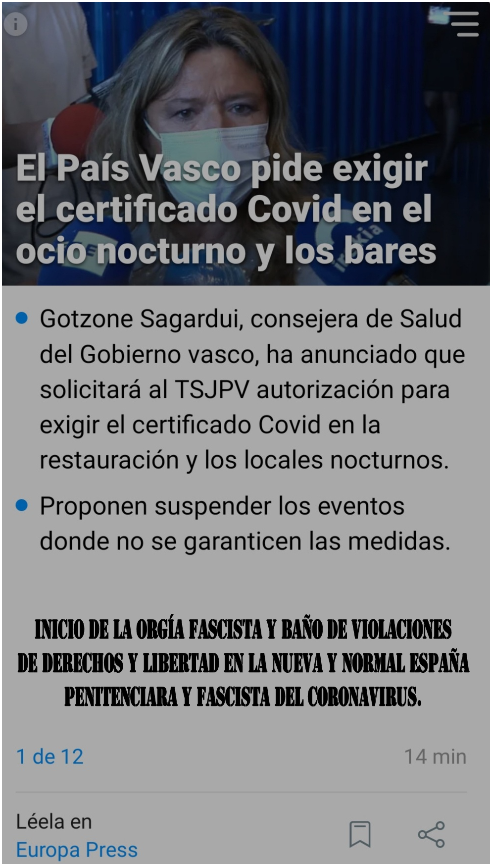 Todos los gobiernos de las taifas autonómicas españolas, sus caciques autonómicos y secuaces se apresuran ya, como ocurre en cada ola de fascismo de coronavirus en verano e invierno; a violar los derechos fundamentales y libertades de los ciudadanos (que a los cabestros no es que les moleste especialmente y son legión; o sea, violan sus derechos, incluso a sus hijos y aplauden), constituyéndose así la sexta Orgía de la Sanidad Fascista en España, intentando ponerse a la par que la Austria Nazi. Y sin duda alguna, lo conseguirán. El gobierno chino fascistacomunista, debe estar encantado con su nueva Cuba (la Nueva y Normal España Penitenciaria Fascista del Coronavirus).