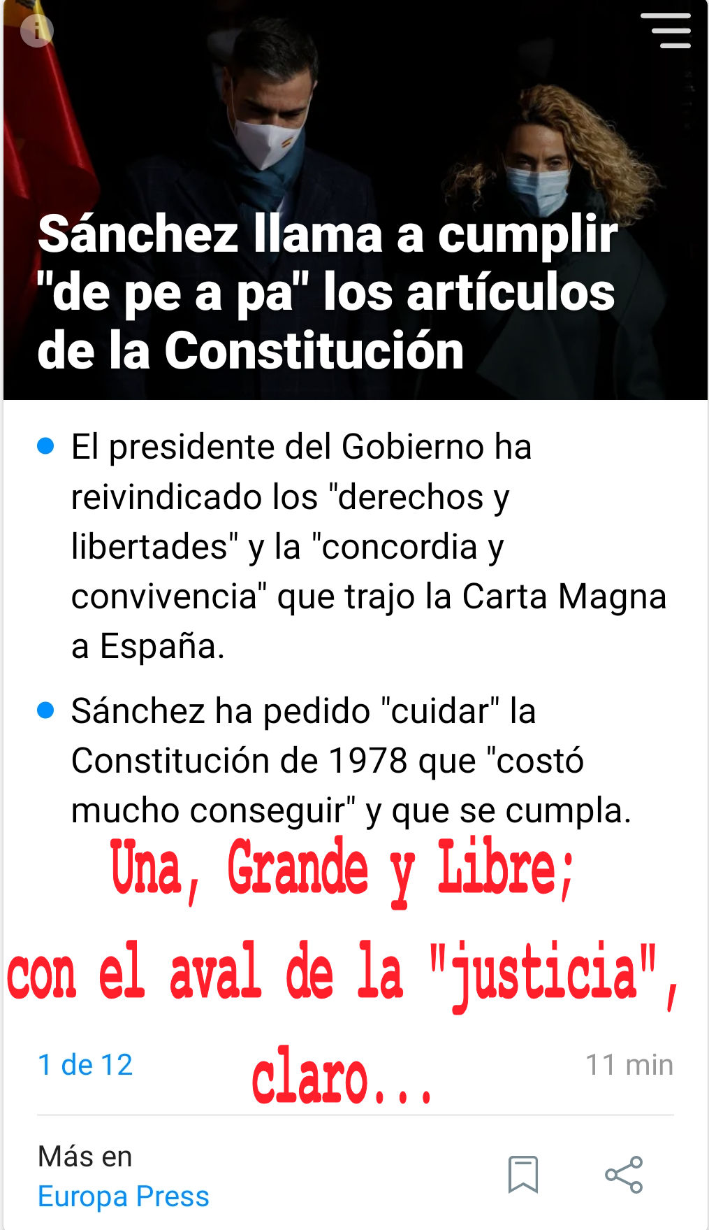 Los dictadores españoles están sometidos al mismo y proverbial analfabetismo endémico del país que gobiernan con mano que no tiembla, y por lo tanto no tienen ni idea de lo que es y significa la palabra “libertad”; cosa que les podría disculpar al no tener responsabilidad de padecer ese analfabetismo genético con aval de la “justicia”.