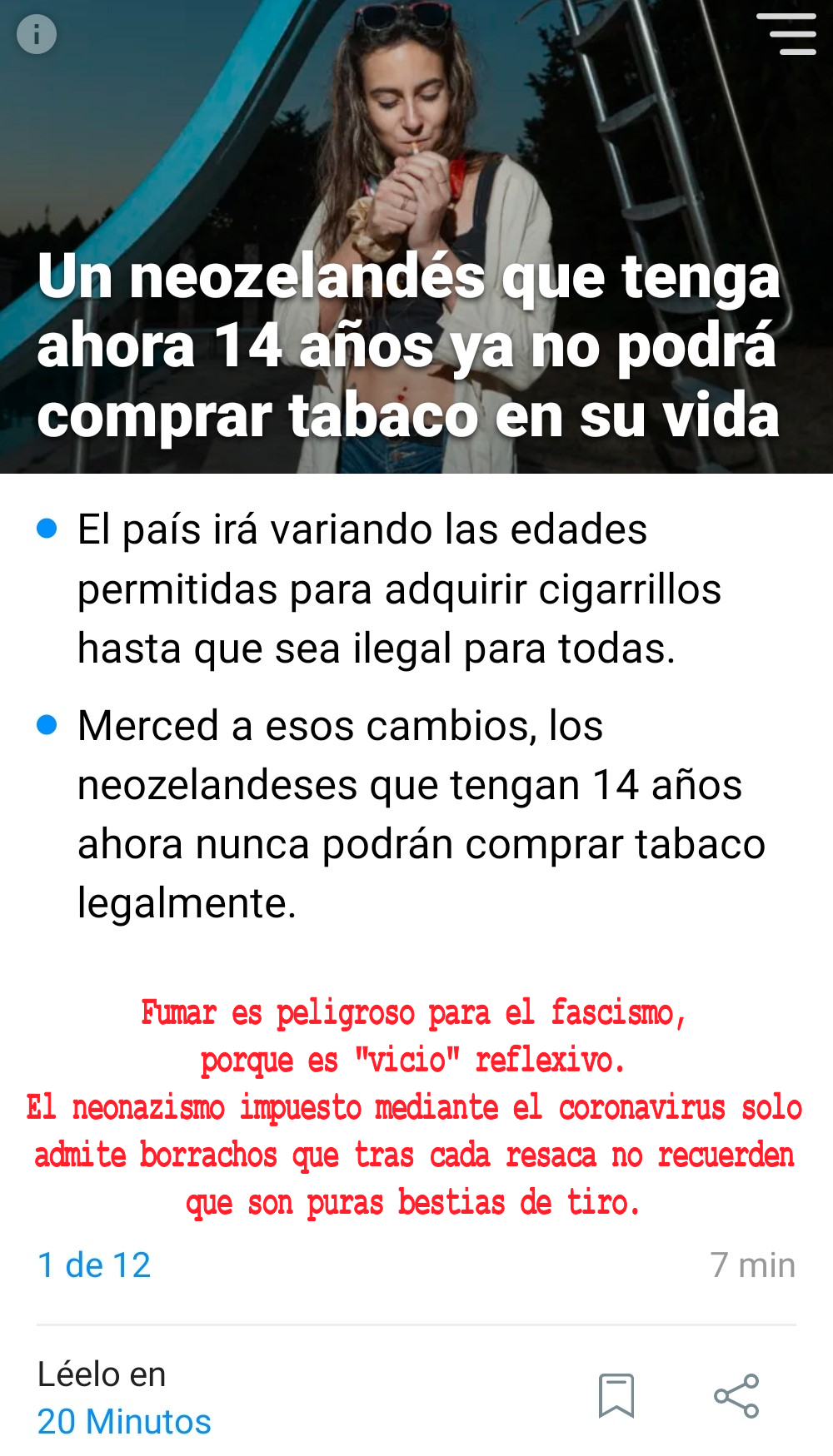 Es fascinante observar como la lepra del neonazismo que ha robado todo derecho y libertad en todo el planeta mediante el coronavirus, sigue planificando su estrategia de esclavización y castración intelectual ya a décadas vista; gracias a la mansedumbre que han demostrado las poblaciones de los países infectados de fascismo. El total dominio del neonazismo sobre los medios de comunicación es absoluto, absolutista hasta la náusea. El alcohol es la única droga que aceptará el nuevo Nazismo pseudo Sanitario; y para ellos, para los nuevos y normales jerarcas nazis, quedará además la cocaína que ahora tiene que rascar el servicio de limpieza de la porcelana de los lavabos de las cortes, parlamentos, juzgados y ministerios de todos los países que han instaurado su terror fascista de coronavirus. Según esta noticia, Nueva Zelanda será de los primeros nazismos en poseer esclavos nacidos que no pidan libertad y que ofrezcan las venas de su cuerpo para ser inoculados con lo que los actuales y futuros führers decreten. Es como asistir a una película donde una monstruosa babosa venenosa, arrasa a toda la humanidad hasta convertirla en mierda que camina a dos patas. Borrachos sí, fumar y reflexionando, no. Es tanto como decir que la libertad es enfermedad. Es mucho más grotesco de lo que cualquiera pudiera pensar. Los actuales líderes políticos son auténticos tumores malignos para la libertad, la inteligencia y el individuo como ser pensante. Asisto a una mala película con malos actores, con un guion previsible y un decorado mediocre; pero es fascinante ver como toda esa mierda avanza imparable por encima de una ciudadanía llamada a la esclavitud y a la narcosis eterna del alcohol en cámara lenta. Pobres neozelandeses, serán los primeros en morir como seres humanos, y los primeros en nacer como cerdos de granja. Fuma y piensa, aunque sea por pura rebeldía, porque apenas queda tiempo para ejercer la libertad del pensamiento siquiera.