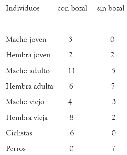 Conclusiones: Los machos jóvenes con bozal son un poco más gallinas que las hembras jóvenes con bozal. No han paseado machos jóvenes sin miedo. Las hembras jóvenes con bozal y sin bozal, son gallinas y sin miedo a partes iguales.. Los machos adultos son más del doble de gallinas que los que no tienen miedo. Y casi el doble que las mujeres adultas gallinas. De hembras adultas hay una gallina menos que las sin miedo. De machos viejos hay uno más de gallina que de los sin miedo. De hembras viejas, hay cuatro veces más gallinas que las que no tienen miedo. Los ciclistas todos gallinas. No hay perros gallinas. (Moi, como técnico estadístico me he anotado como macho viejo sin bozal (no gallina): 1 unidad).