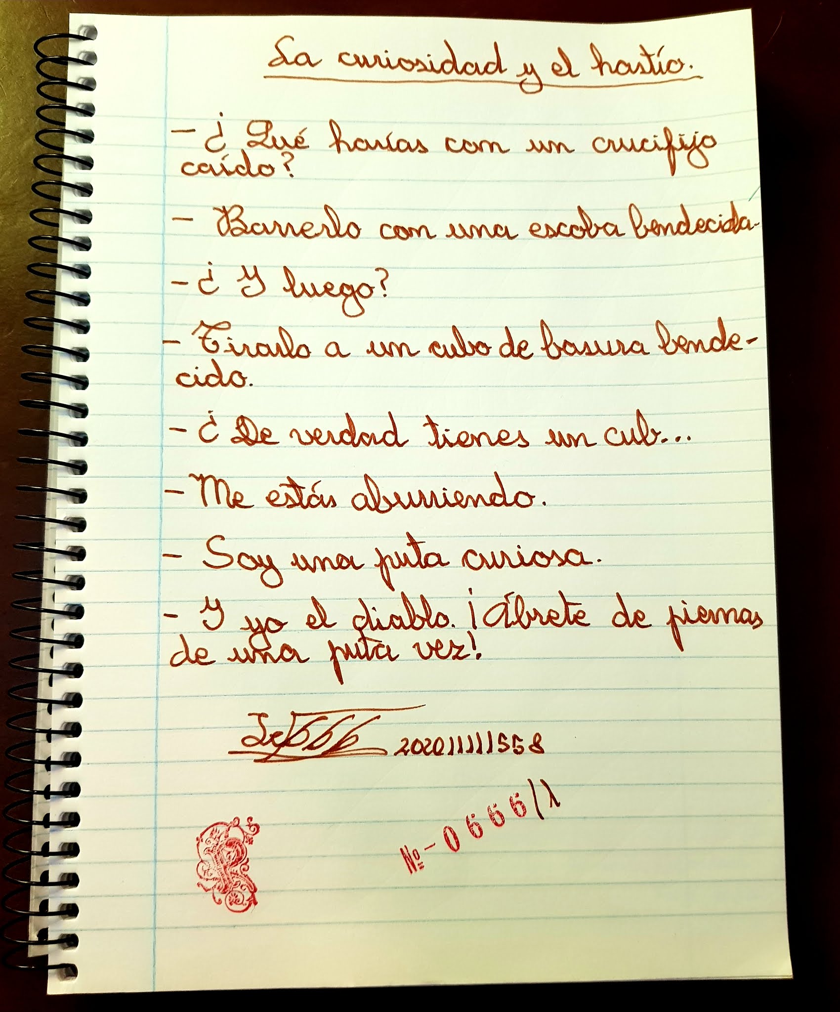 En estas entrañables fiestas navideñas del Año de los Hijoputas del Fascismo del 2020, deseo que los que intentan robar y controlar mi libertad mueran entre fuertes dolores, vomitando sangre por la boca con las vísceras en descomposición. A saber quiénes: Así deseo que mueran reyes, presidentes y ministros; y así mismo sus seres queridos, familia y amigos. Así deseo que mueran los altos funcionarios; y así mismo sus seres queridos, familia y amigos. Así deseo que mueran los médicos y periodistas que propagan las mentiras que intentan robar mi libertad; y así mismo sus seres queridos, familia y amigos. Así deseo que mueran jueces, militares, bofia y serenos de las noches negras, carceleros de la libertad; y así mismo sus seres queridos, familia y amigos. Así deseo que mueran vecinos acusadores y confidentes; y así mismo sus seres queridos, familia y amigos. Y que a los cobardes se les seque la sangre en las venas. Mi alma (si la tuviera) será tuya cuando haya muerto todo aquel aquí designado. Solo pretendo ver morir hasta el último mono y sentirme en paz. ¡Oh Mi Negro Señor de Maldad y Muerte! Mi sangre te pertenece, con ella pacto ante vos, el pago por mis deseos cumplidos. Que la sangre de los que deben morir en estas entrañables fiestas, forme ríos visibles desde el profundo espacio. ¡Oh Mi Negro Señor de Maldad y Muerte!